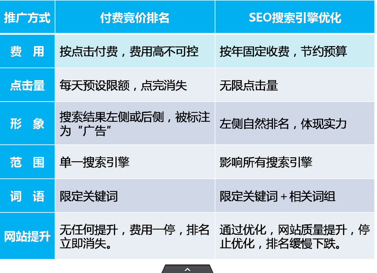 第一,seo属于自然的网站排名,是依据网站自身的权重和可信度的一种排名方式,而竞价属于付费排名,是依据竞价网页的匹配度和出价高低而排名的。也有人说竞价就 是付费的排名,seo就是免费的排名;但是这个也不完全正确,因为seo表面看起来是免费的,但是需要付出较多的人力和物力的。